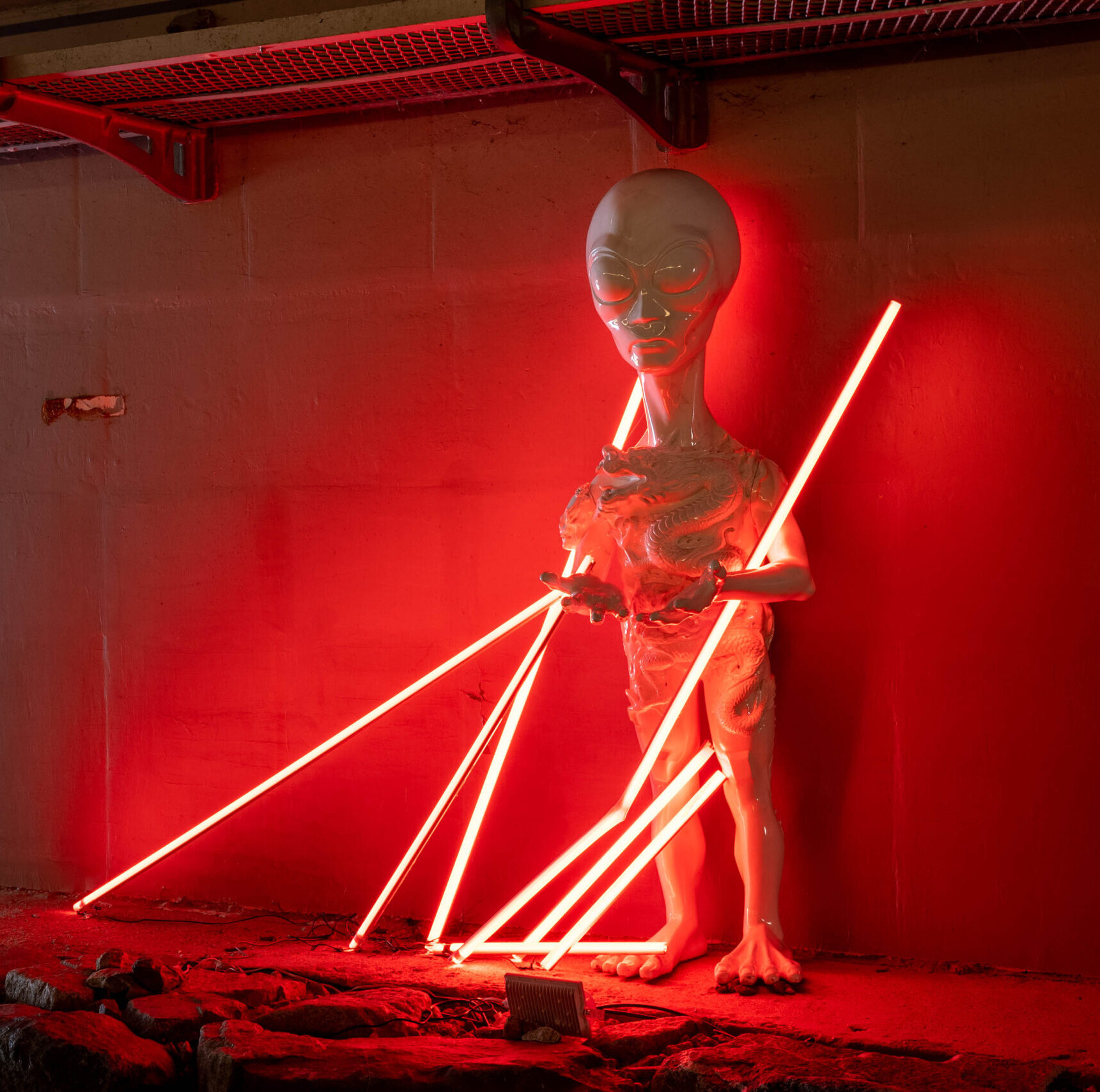 이한수 <우주 깔대기> Lee Hansu <Space Funnel> 말은 현재 지구를 의미하고 구름과 외계인은 우주를, 비너스변형와상 조형물은